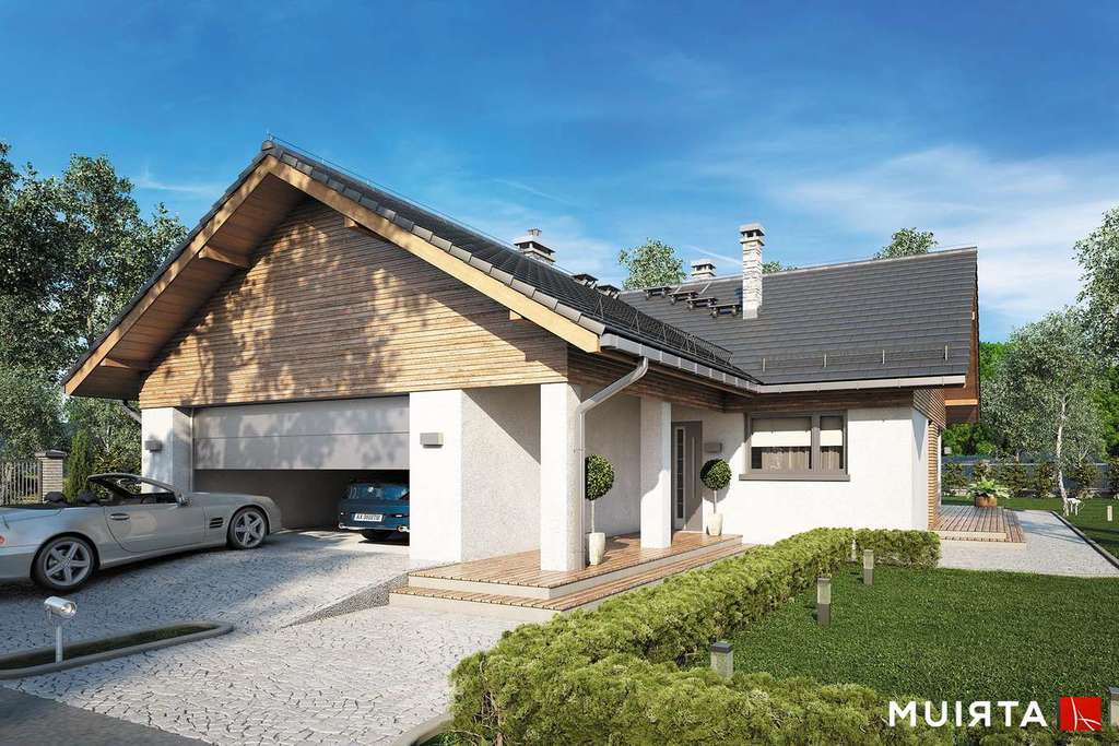 Wspaniała propozycja dla zmotoryzowanej, czteroosobowej rodziny. Budynek oprócz wysuniętej do przodu części garażowej posiada zaplecze gospodarcze, w postaci dużej kotłowni. Na pozostałych 100 metrach kwadratowych znajduje się wygodne mieszkanie z trzema sypialniami, dwoma łazienkami oraz pokojem dziennym połączonym z jadalnią i kuchnią. Układ konstrukcyjny budynku stanowią ławy fundamentowe, żelbetowe, ściany fundamentowe spięte wieńcem żelbetowym, ściany nośne w konstrukcji szkieletu drewnianego, a strop drewniany lekki. Dach dwuspadowy, z przenikającym się nawzajem kalenicami o ustroju jętkowym, z murłatami spiętymi kleszczami. Pokrycie dachu zaproponowano z betonowej dachówki w kolorze grafitu, a elewacje jasne z okładziną imitującą deski.